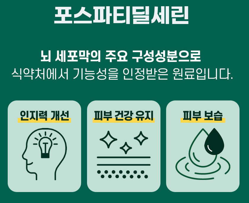 실제로 포스타디딜세린의 연구 결과를 보면 인지력, 기억력, 학습능력 등에 효과가 있는것으로 확인되었으며, 평균 연령 60.5세의 환자 50명을 대상으로 매일 포스파티딜세린을 12주간 투여한 결과,