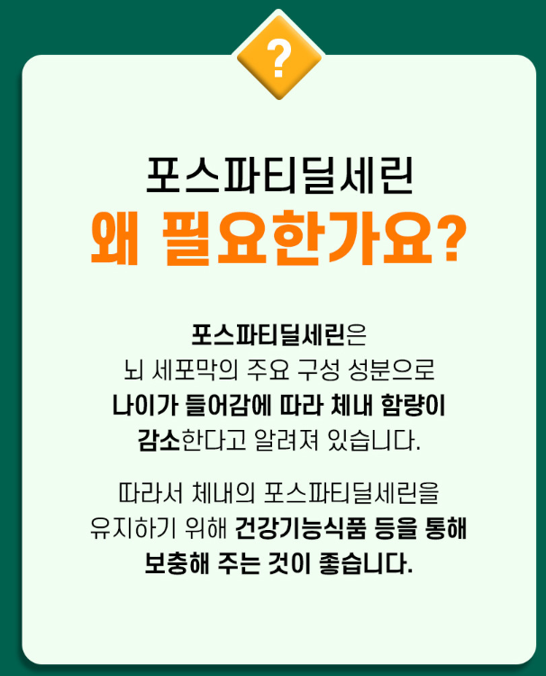 미국 FDA, 국내 식품의약품안전처에서도 노화로 인한 인지력 개선에 포스타디딜세린이 도움이 된다고 하였습니다.